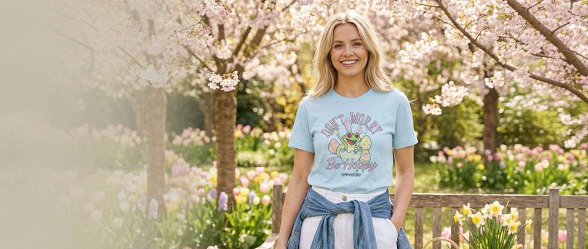 Featuring a cheerful frog popping out of a pastel Easter egg surrounded by colorful spring eggs, this playful design is paired with the feel-good phrase: “Don’t Worry, Be Hoppy.” Set against a soft light blue backdrop, the artwork captures the whimsical, jungle-inspired spirit fans love.